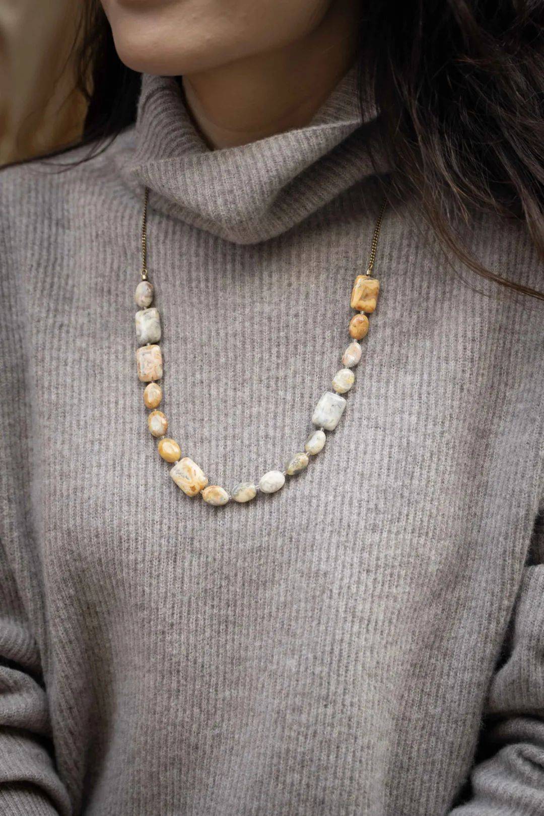 此款玛瑙石项链由天然彩纹玛瑙与灰玛瑙相连而成,每一颗都以独特的恩典印记来诠释它的与众不同,它们经历时光的洗礼、挤压、冲刷,在日以继夜的磨塑下终成为闪耀的美丽,不同的形状与色彩,在精心的排列组合下呈现和谐的美感。也借此提醒淑女以感恩喜乐的心来面对生活,不要忘记“每个日子都是生命的礼物”,你的人生也将是一个独特且闪耀的恩典记号……